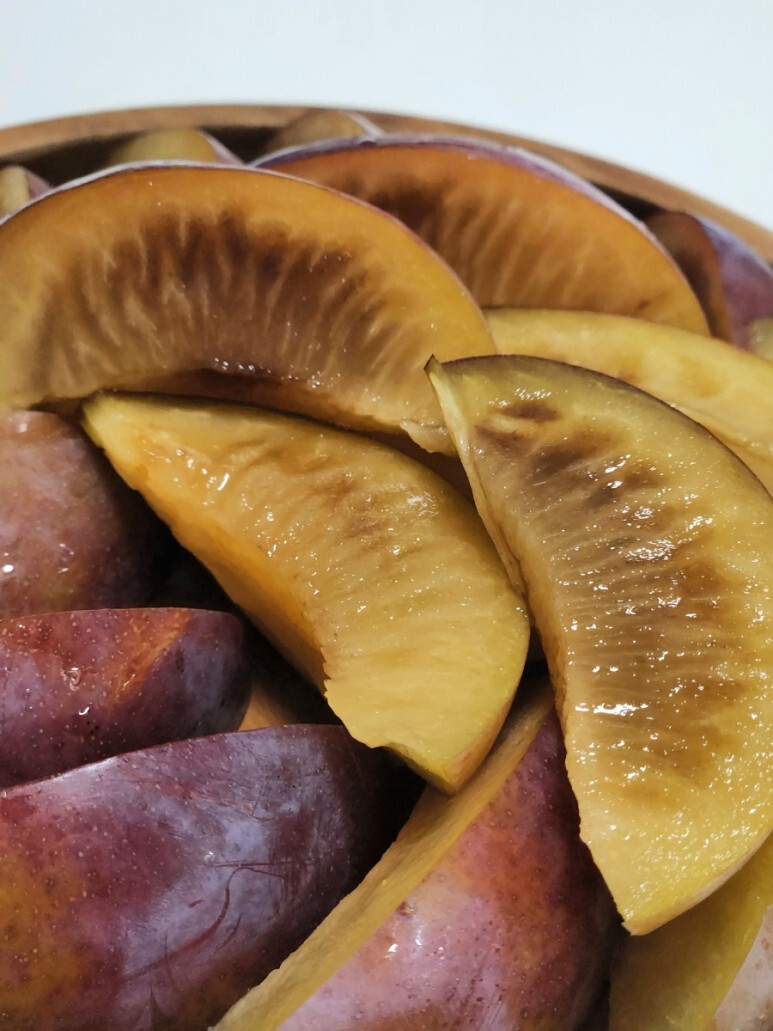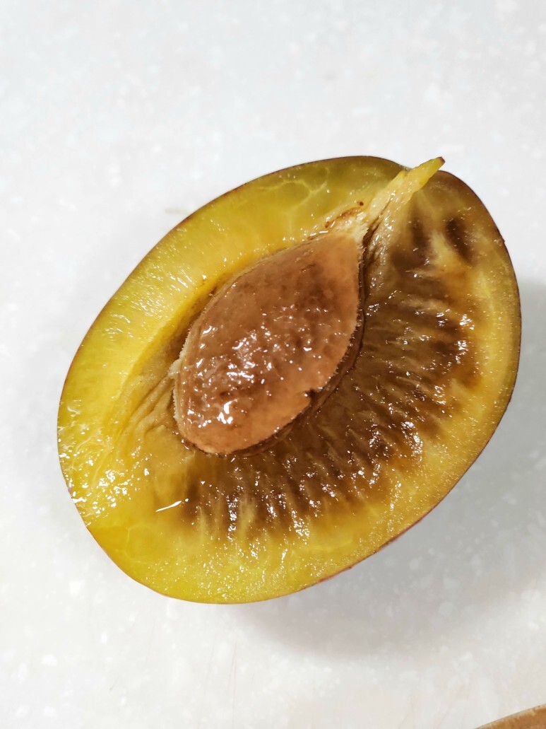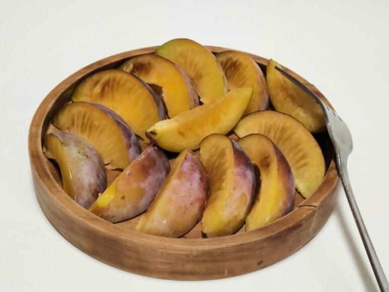 노오란 상태에서 먹을 때 맛과 식감은 우리나라 자두의 새콤달콤한 맛과 비슷하거나 조금 더 새콤하구요, 식감도 일반 자두와 똑같습니다.